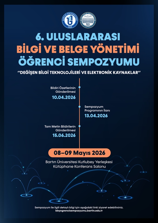 Azerbaycan Bakü Devlet Üniversitesi Bilgi ve Belge Yönetimi Fakültesi ile Bartın Üniversitesi Bilgi ve Belge Yönetimi Bölümü’nün ortak organizasyonu ile düzenlenen 6. Uluslararası Bilgi ve Belge Yönetimi Öğrenci Sempozyumu, Azerbaycan halkının Millî Lideri Haydar Aliyev’in doğumunun 103. yıl dönümüne ithafen, 8–9 Mayıs 2026 tarihlerinde Bartın Üniversitesi ev sahipliğinde gerçekleştirilecektir.
